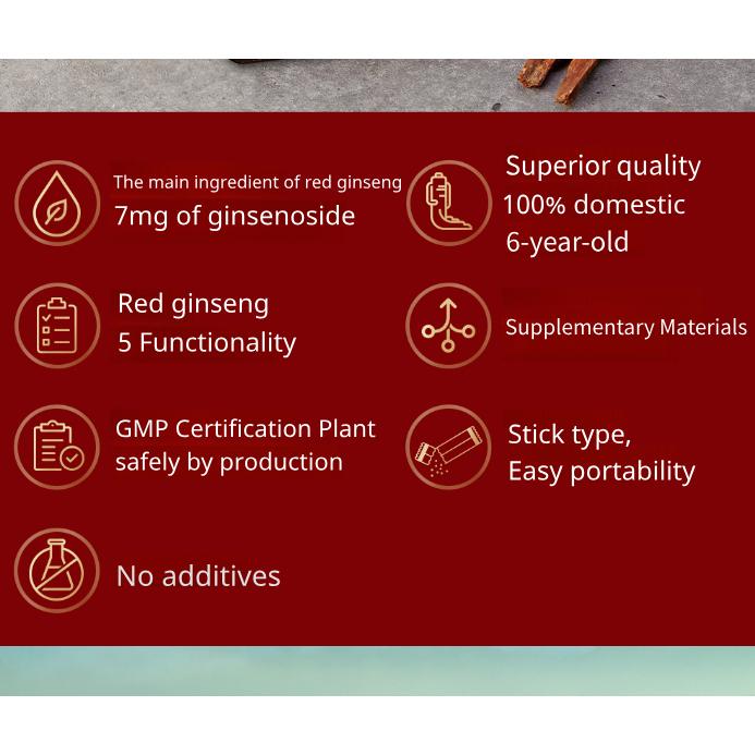| Sastojci | Red Ginseng Concentrate (6-Year Root, Solid 60%, Ginsenoside Rg1, Rb1 and Rg3, Total: 12 mg/g, Korea) / Less Sugar, Purified Water, Mixed Plants Concentrate (Solid 60%, Cichorium Intybus (Chicory) Root (Korea), Phoenix Dactylifera (Date) Seed (Korea), Paeonia Lactiflora Root (Korea), Rehmannia Chinensis Root, Polygonatum Officinale Rhizome/Root, Astragalus Membranaceus Root, Angelica Gigas Root, Cnidium Officinale Root, Purified Water), Maltodextrin, Fructooligosaccharide, Red Ginseng Flavor |