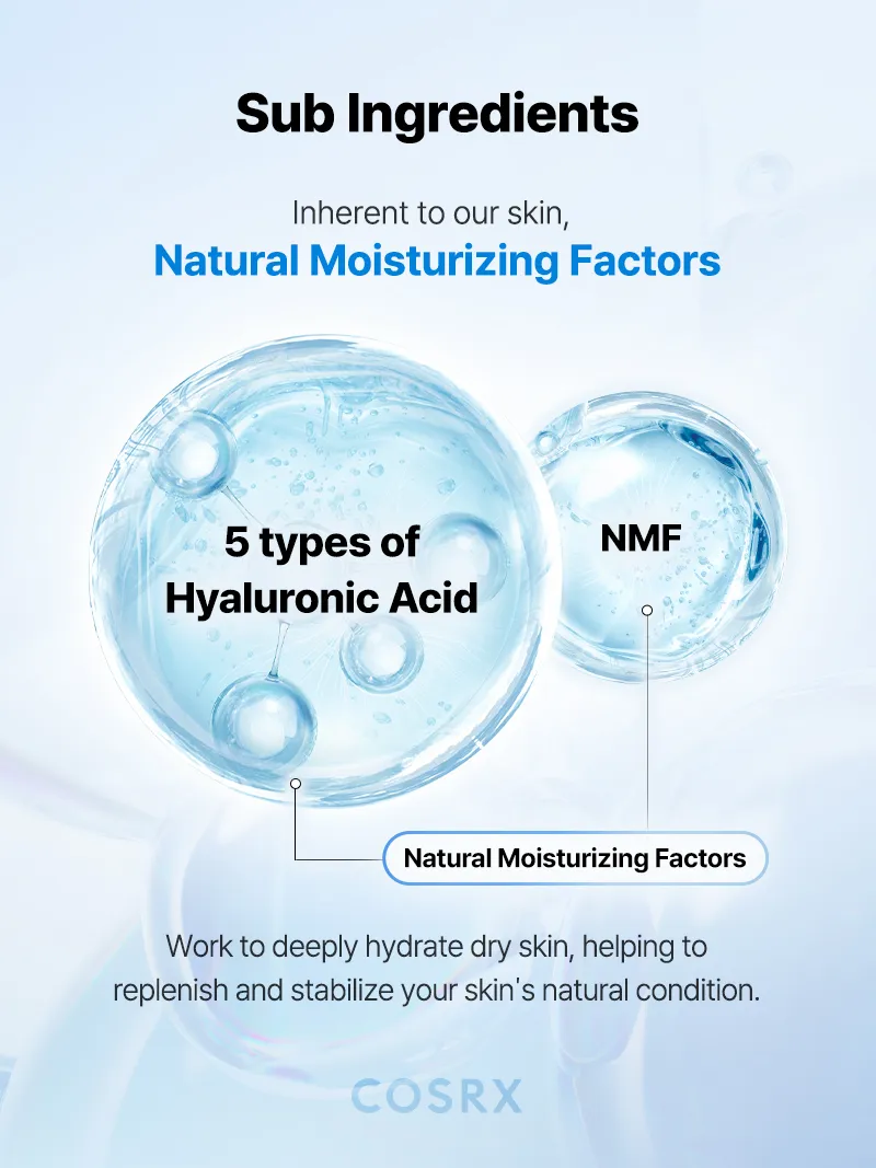 Višestruki oblici hijaluronske kiseline omogućavaju hidrataciju na više nivoa. Površinski slojevi dobijaju trenutnu vlagu, dok manji molekuli pomažu dugotrajnije zadržavanje vode. Koža postaje vidno punija i elastičnija. Sprej ne stvara težinu uprkos visokom hidratantnom potencijalu. Posebno je koristan kod dehidrirane kože tokom dana. Njegovo dejstvo je brzo, ali stabilno.