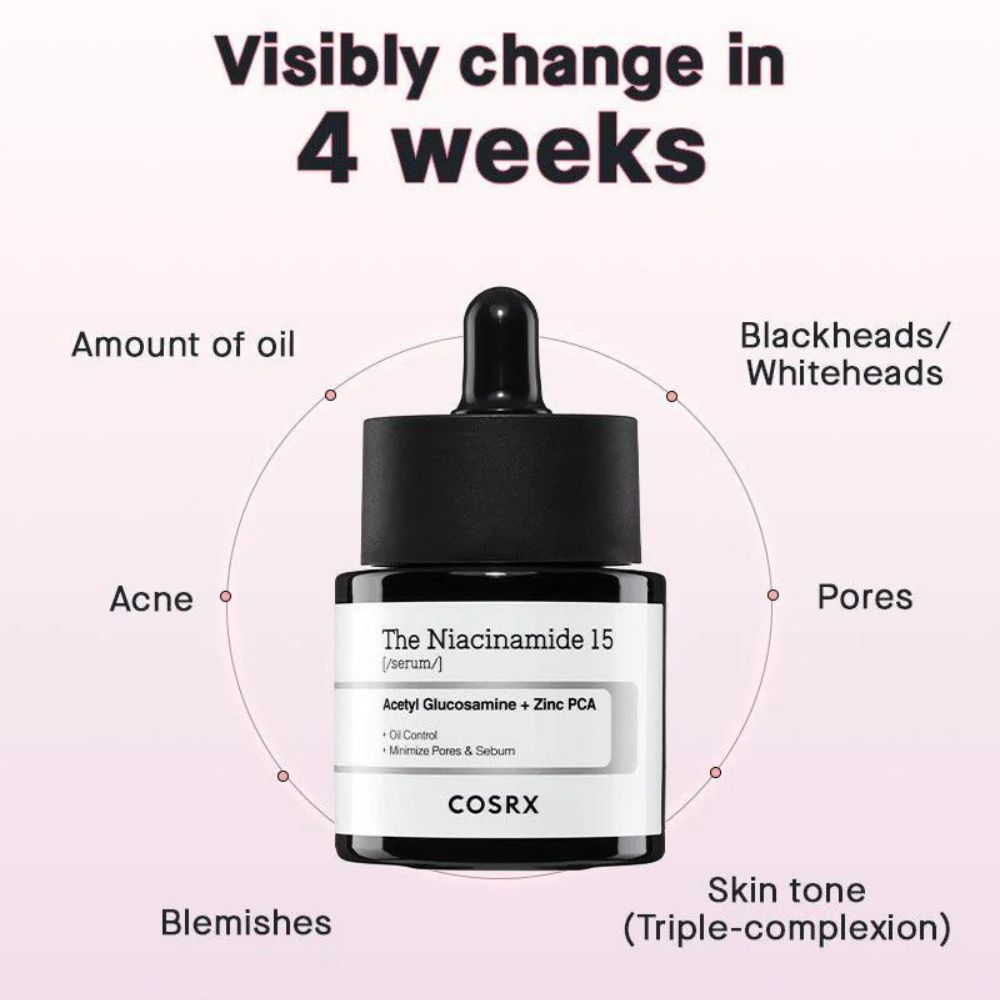 - Reguliše sebum i sužava pore – Niacinamid 15% i cink PCA smanjuju masnoću i sprečavaju nastanak akni.
