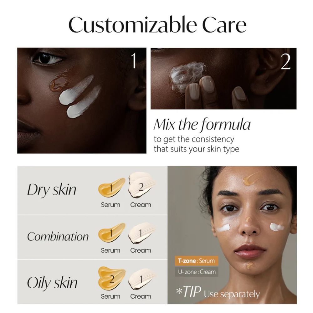 | Način upotrebe | Na kraju rutine nege kože, pomoću priložene spatule, pomešajte serum i kremu u proporciji koja odgovara potrebama vaše kože tog dana. Nanesite ravnomerno na lice i nežno umasirajte dok se potpuno ne upije. Proizvod se može koristiti ujutru i uveče, prilagođavajući odnos seruma i kreme u zavisnosti od sezonskih promena i stanja kože. Za laganiju hidrataciju koristite više seruma, dok za intenzivniju negu dodajte više kreme. |