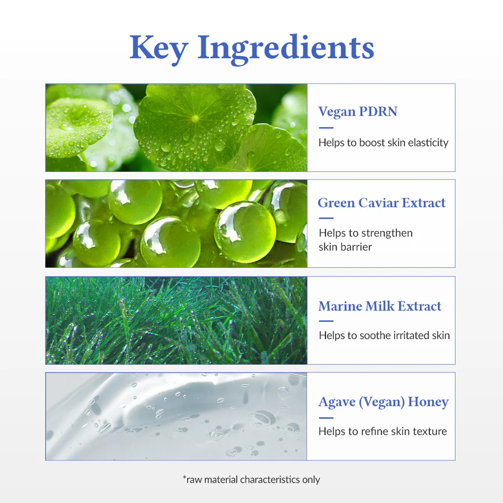 Ekstrakt zelenog kavijara je morski sastojak bogat polisaharidima. Deluje tako što pomaže očuvanju vlažnosti kože. U formuli ima ulogu jačanja barijerne funkcije. Doprinosi glatkijoj teksturi kože. Ne ostavlja težak ili lepljiv osećaj. Dugoročno pomaže koži da zadrži vlagu.