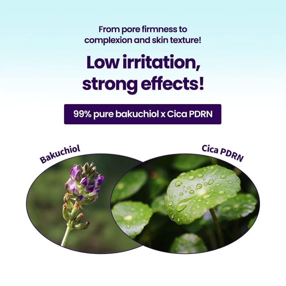 Bakuchiol Pore-Jet Serum pruža sveobuhvatnu negu kože fokusirajući se na ključne probleme poput proširenih pora, neujednačenog tena i gubitka elastičnosti. Bakuhiol deluje slično retinolu, ali bez iritacija, smanjujući veličinu pora i poboljšavajući teksturu kože. Niacinamid u visokoj koncentraciji posvetljuje kožu, smanjuje hiperpigmentacije i ujednačava ten. Cica PDRN kompleks regeneriše kožu, povećava njenu čvrstoću i elastičnost, pružajući mladalački izgled. Redovnom upotrebom, koža postaje glatka, blistava i vidljivo poboljšane strukture.
