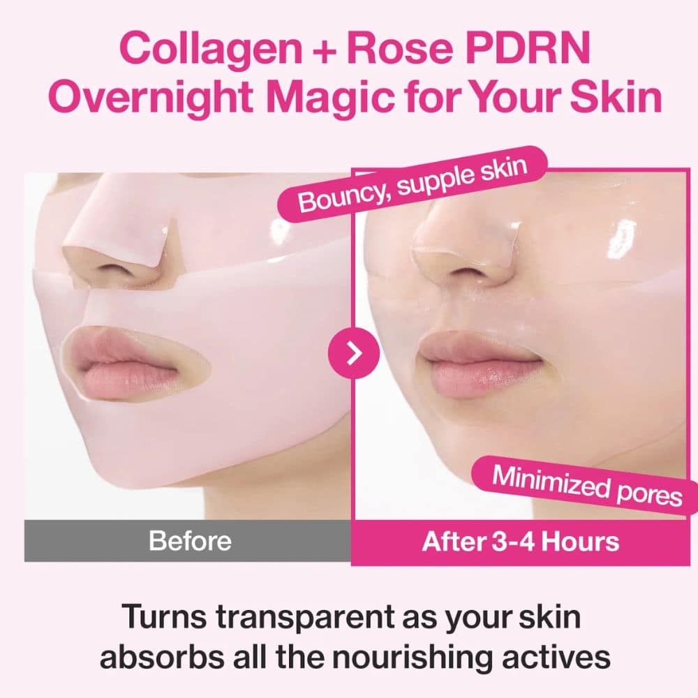 Ova maska je formulisana tako da u toku noći koži pruži maksimalan efekat regeneracije i obnove. Rose PDRN podstiče obnovu ćelija i jača prirodnu barijeru, dok visoka koncentracija kolagena i kompleks od 9 peptida obnavljaju strukturu kože i vraćaju joj elastičnost. Tekstura bogata aktivnim sastojcima stvara zaštitni sloj koji zadržava vlagu tokom spavanja, pa se koža budi hidrirana, glatka i osvežena. Klinički podaci pokazuju da maska vidljivo poboljšava izgled bora i punoću obraza i čela. Bez veštačkih boja i mirisa, pogodna je i za osetljivu kožu. Redovnom upotrebom koža postaje čvršća, ujednačenija i zdravijeg sjaja.