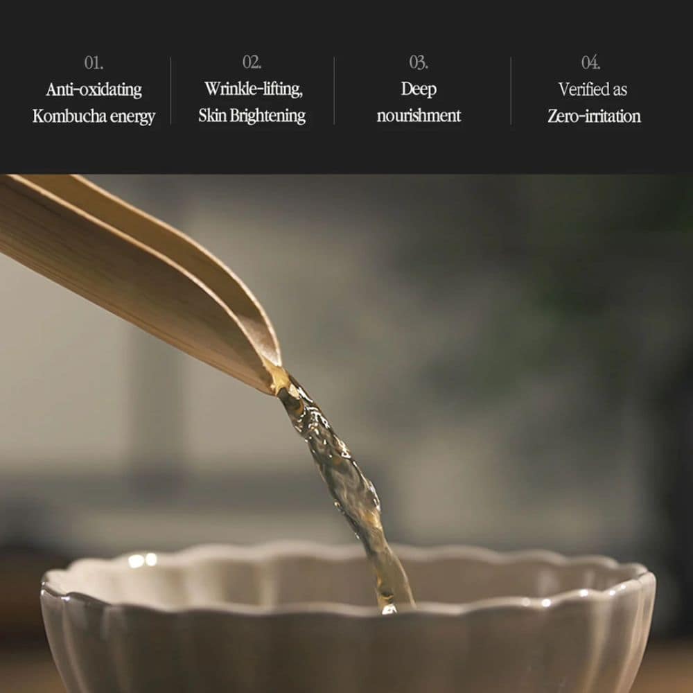 Ovaj luksuzni tonik kombinuje blagodeti fermentisanog crnog čaja i prirodnih ekstrakata u gelastoj teksturi koja osvežava i revitalizuje kožu. Kombuča, koja je fermentisana tokom 7 do 8 nedelja, bogata je polifenolima koji pružaju snažnu antioksidativnu zaštitu i obnavljaju strukturu kože. Ekstrakti biljaka kao što su žen-šen i pelin, dodatno poboljšavaju teksturu. Hijaluronska kiselina dubinski hidrira i osigurava dugotrajnu mekoću. Redovnom upotrebom, koža postaje otpornija na spoljne faktore, blistava i ujednačenog tena.