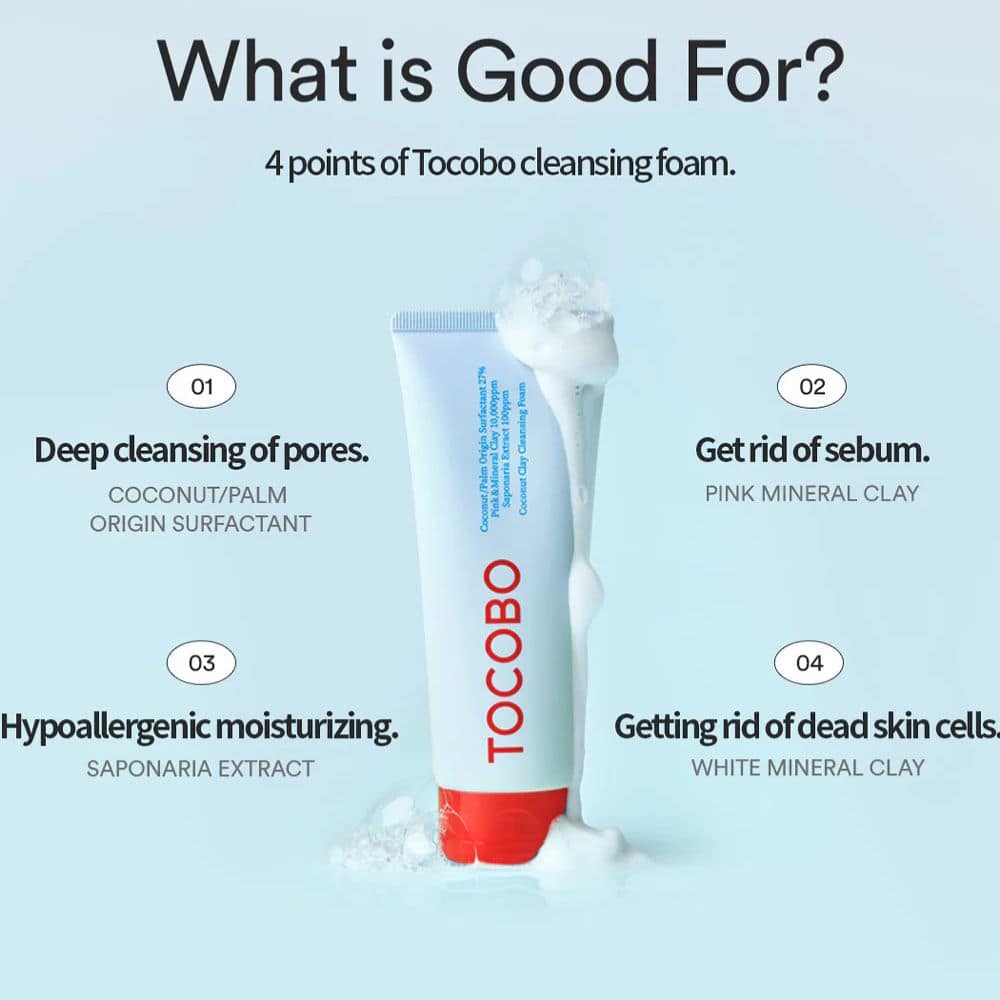 TOCOBO Coconut Clay Cleansing Foam je proizvod namenjen dubinskom čišćenju kože lica. Formulisan sa 27% surfaktanata poreklom iz kokosa i palme, kao i 10.000 ppm ružičaste i mineralne gline, ovaj čistač efikasno uklanja nečistoće i višak sebuma iz pora, ostavljajući kožu čistom i osveženom.